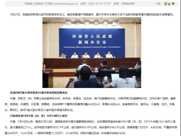 据河南省政府发布,强降水造成7月16日以来,截至27日12时,据国家自然灾害灾情管理系统统计,此轮强降雨造成全省150个县(市、区)1573个乡镇1331.98万人受灾,因灾遇难死亡71人。农作物受灾面积1017.1千公顷,成灾面积457.4千公顷,绝收面积148.1千公顷;倒塌房屋1.55万户、4.85万间,严重损坏房屋3.65万户、13.21万间,一般损坏房屋11.16万户、31.42万间。